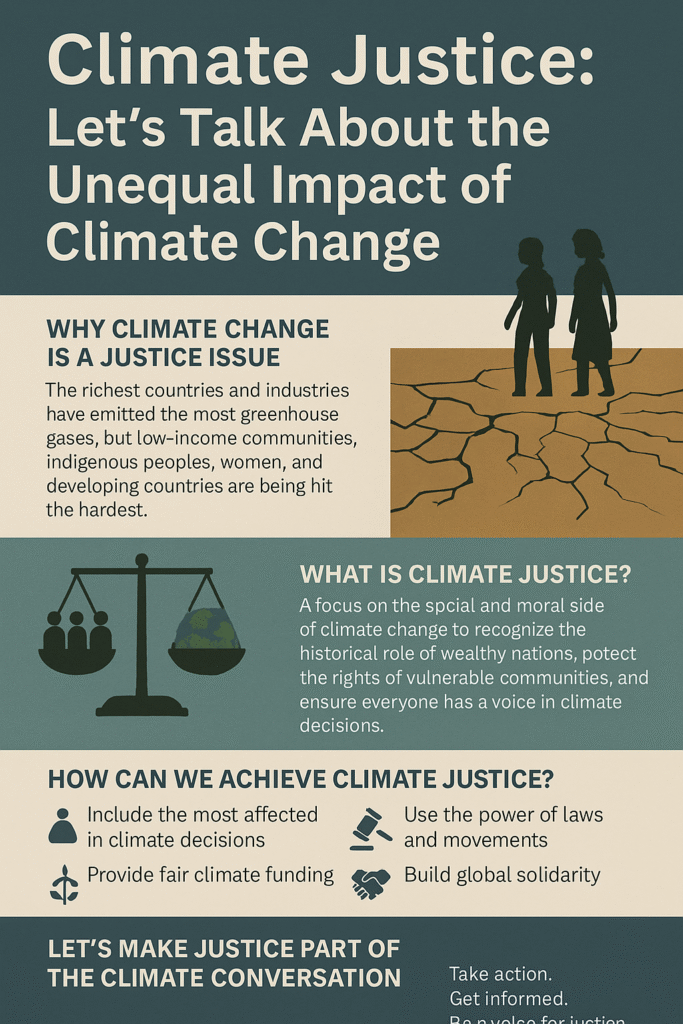 We need to talk about climate justice. Climate change isn’t just about melting ice caps or rising temperatures—it’s about people, fairness, and survival. And here’s the truth: even though climate change affects all of us, it doesn’t affect us equally.